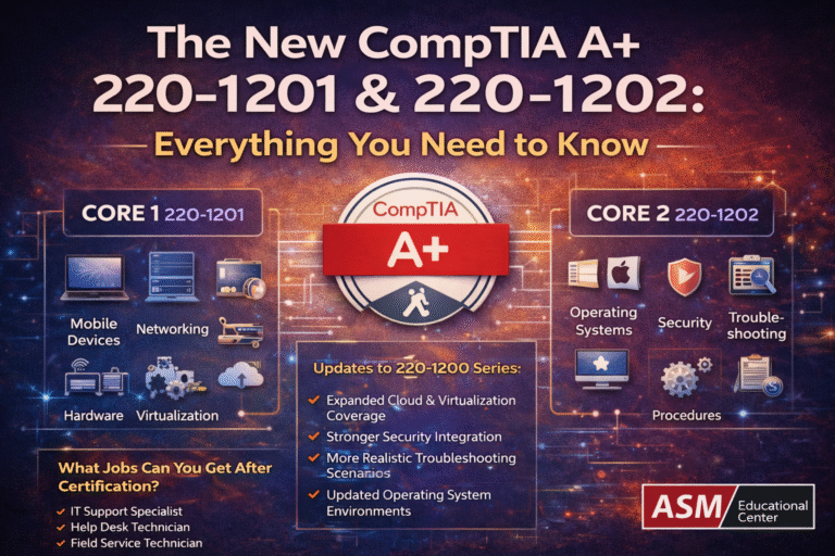 To ensure students are fully prepared for the latest exam version, ASM Educational Center has developed a new course curriculum and exam preparation guide specifically for the 220-1201 and 220-1202 series.